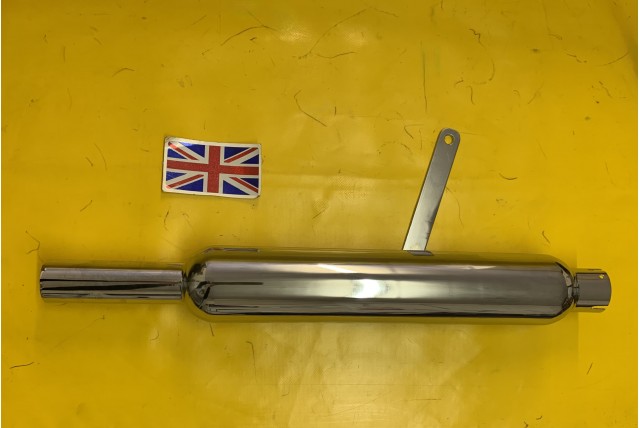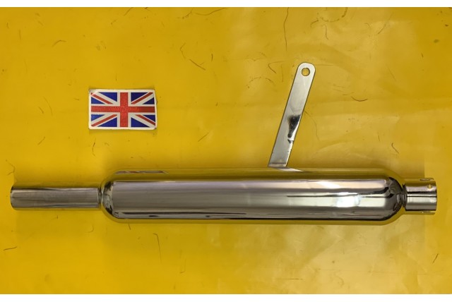 Silencer Royal Enfield barrel type fitted up to 1955 on swinging arm models, has long bracket which slopes forward inlet 1-3/4"